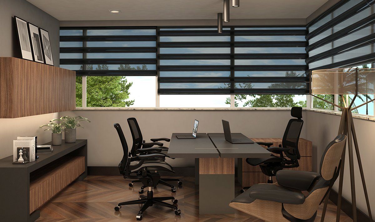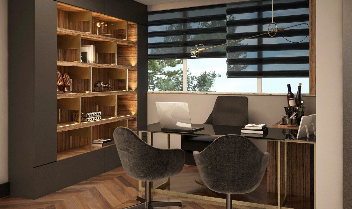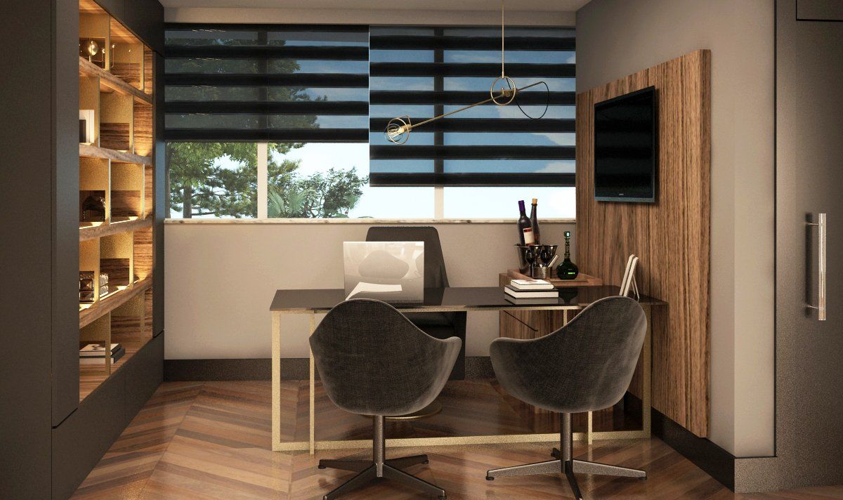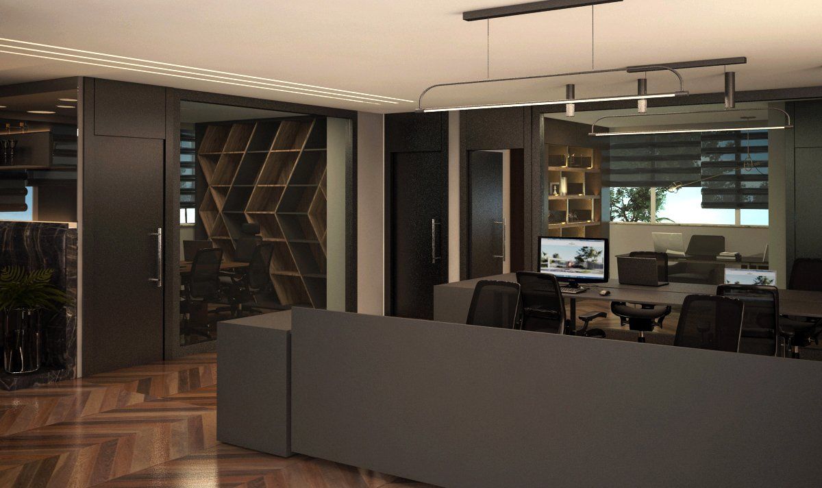 " Neste projeto propomos um estilo de Corportaivo Industrial, onde tem acabamentos na cor grafite, madeirado e inox dourado para dar um toque despojado e ao mesmo tempo classico a pedido do cliente."