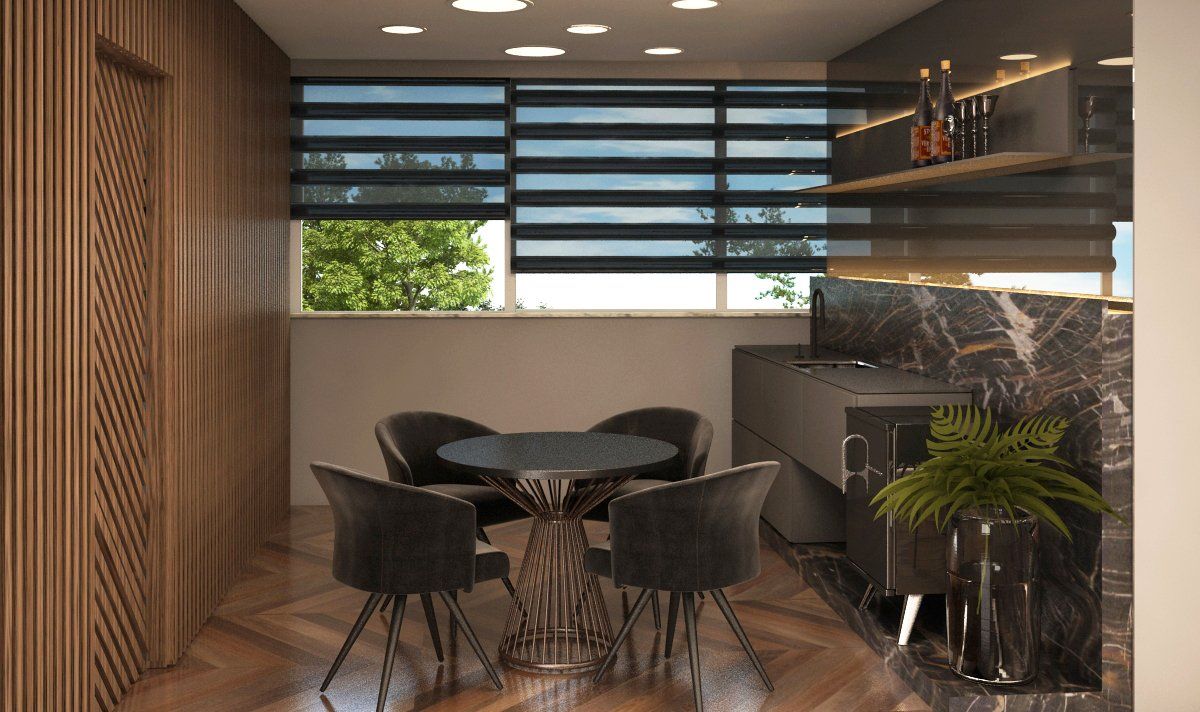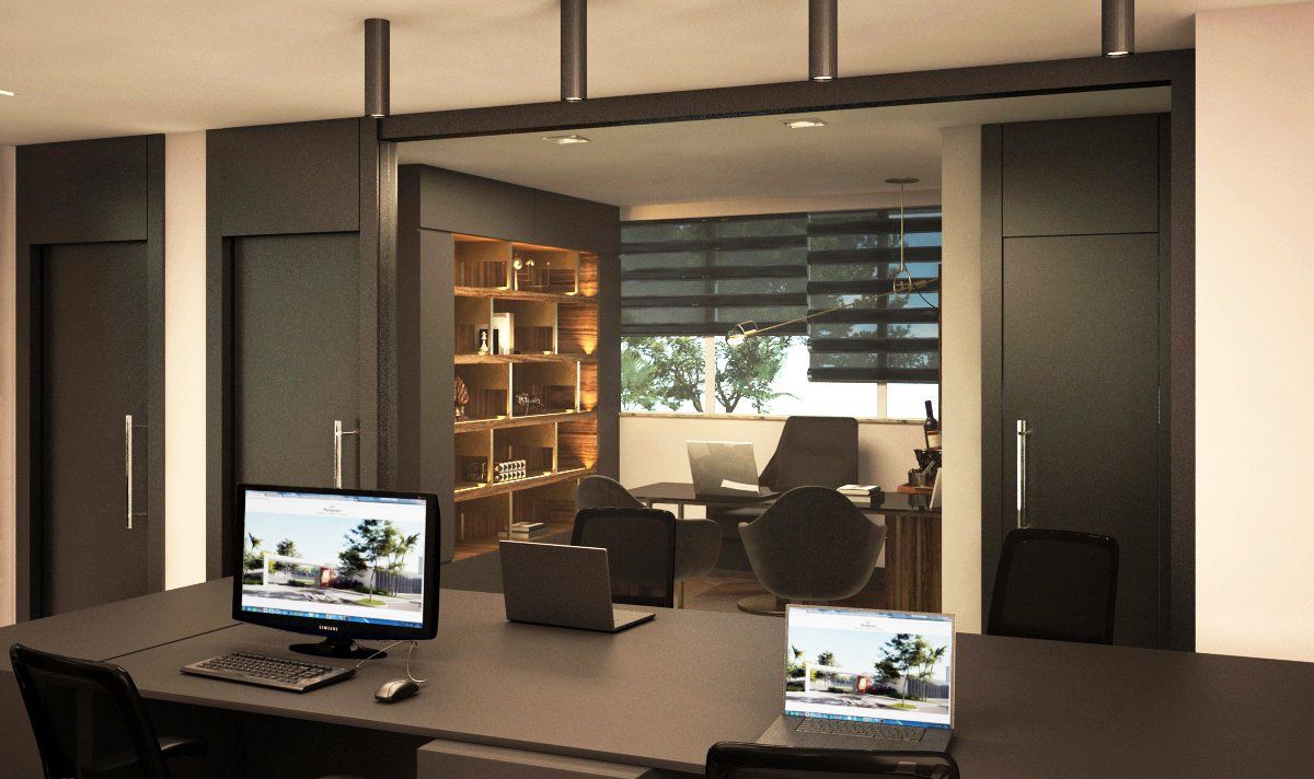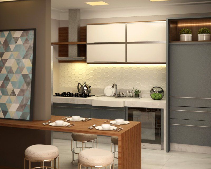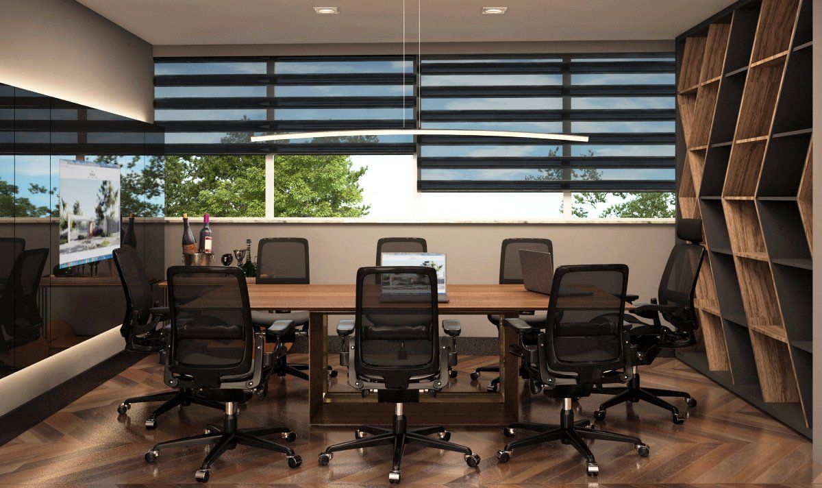 " Neste projeto propomos um estilo de Corportaivo Industrial, onde tem acabamentos na cor grafite, madeirado e inox dourado para dar um toque despojado e ao mesmo tempo classico a pedido do cliente."