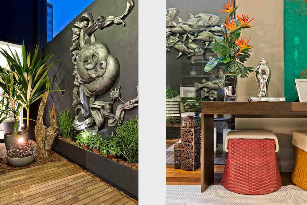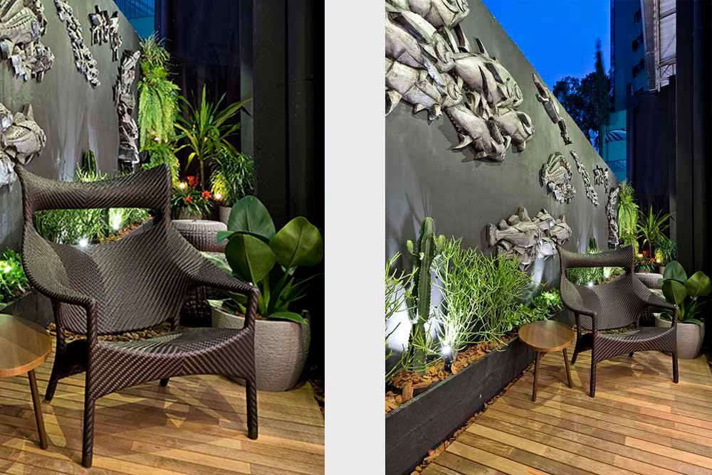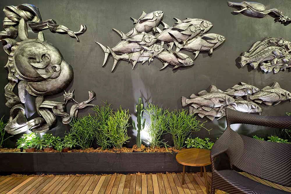 Ambiente envolvido por um paisagismo lúdico e exuberante, com esculturas de cardumes do artista plástico Rafael Sartori em parceria com a Boulle, criando uma área perfeita para contemplação e relaxamento.