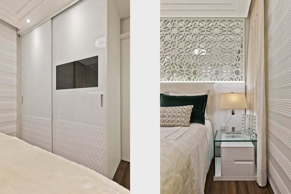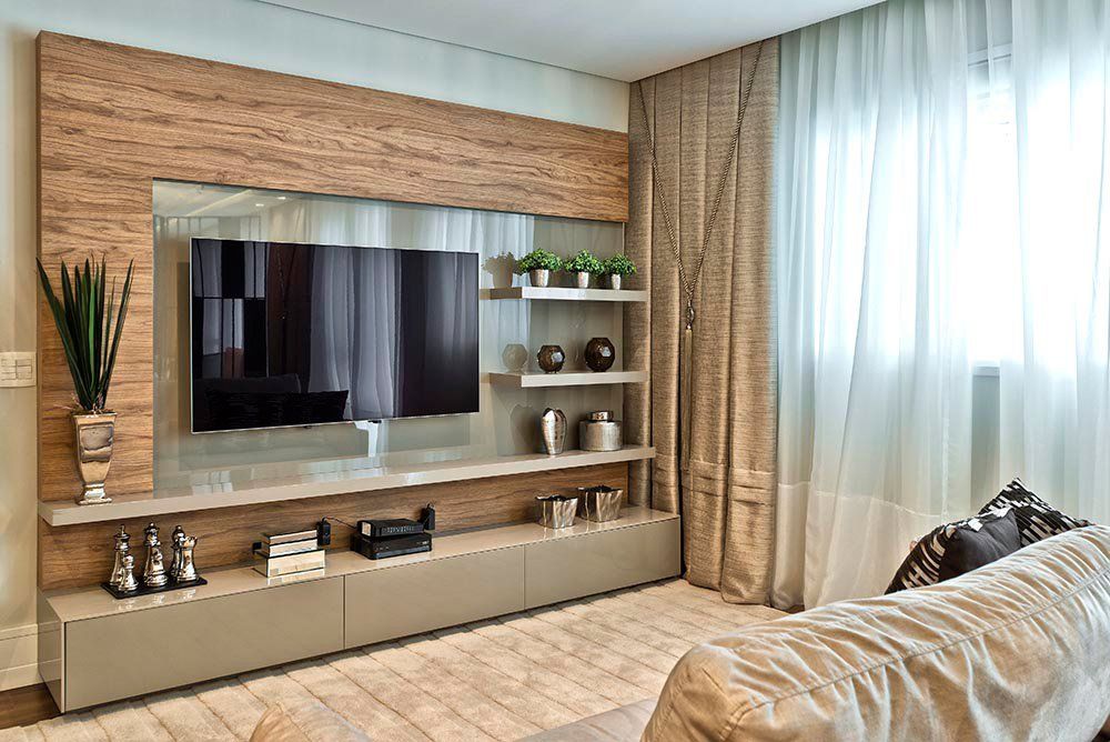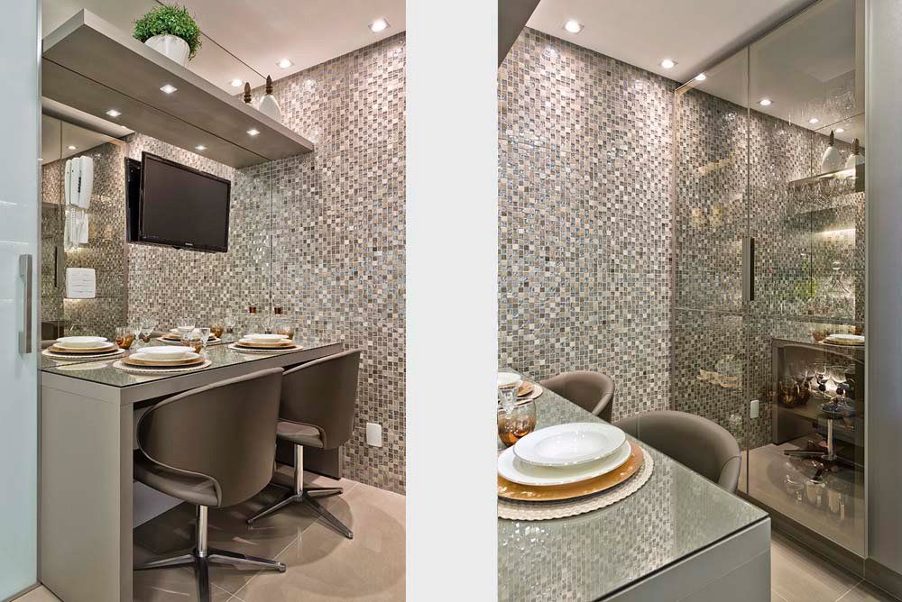 Por ser uma sala longilínea, criamos três ambientes (Living, Sala de Jantar e Home Theater) setorizados através dos detalhes e aberturas no gesso, projeto de iluminação, biombo vazado com espelhos que permitiram separar e ao mesmo integrar, sem perder a leveza e característica de cada espaço.