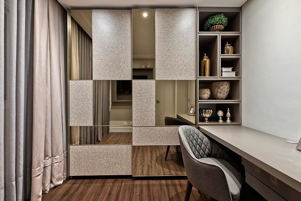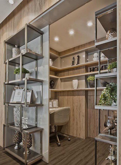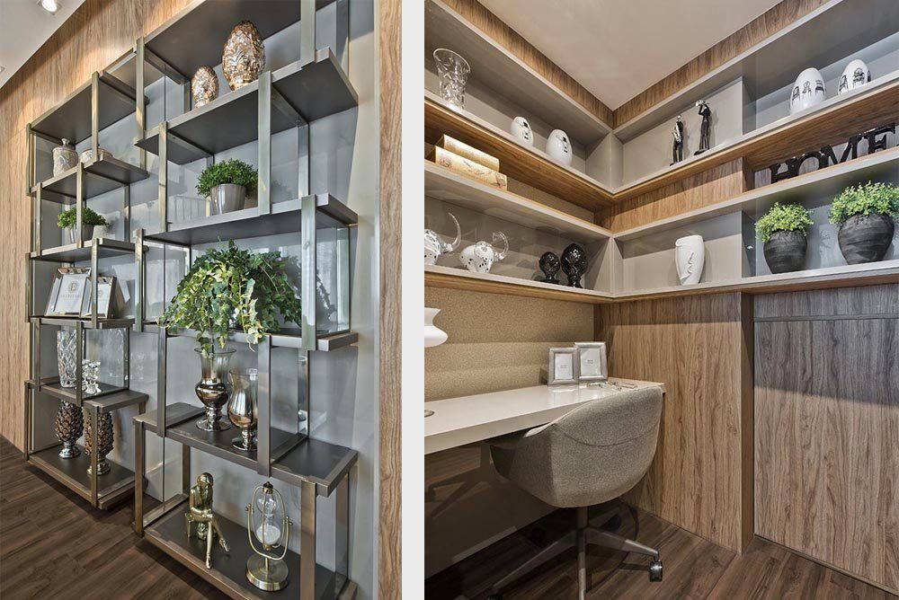 Outra exigência das clientes para esse apartamento foi ocultar o Home Office, onde pudessem guardar seus pertences de maior valor e que outros não tivessem acesso. Então veio a ideia de criar uma automação para que esse ambiente não ficasse evidente, o que foi um desafio.